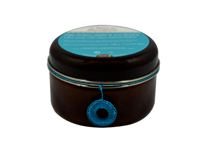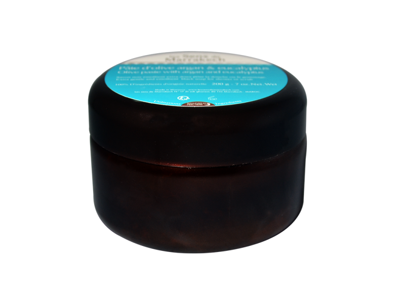 A base d’huile d’argan, d’huile d’olive, parfumé à l’Eucalyptus et fabriqué selon la tradition Marocaine, ce savon noir pour le corps permet un nettoyage naturel et doux sans sulfates et un gommage traditionnel Marocain avec le gant kessa.